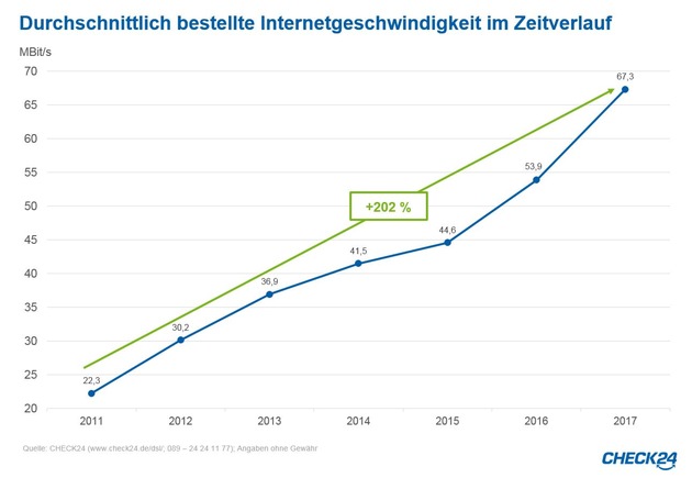 *durchschnittlich bestellte Internetgeschwindigkeit aller Abschlüsse von CHECK24-Kunden im Jahr 2017. Tabelle mit allen betrachteten Städten unter http://ots.de/SNLQRN