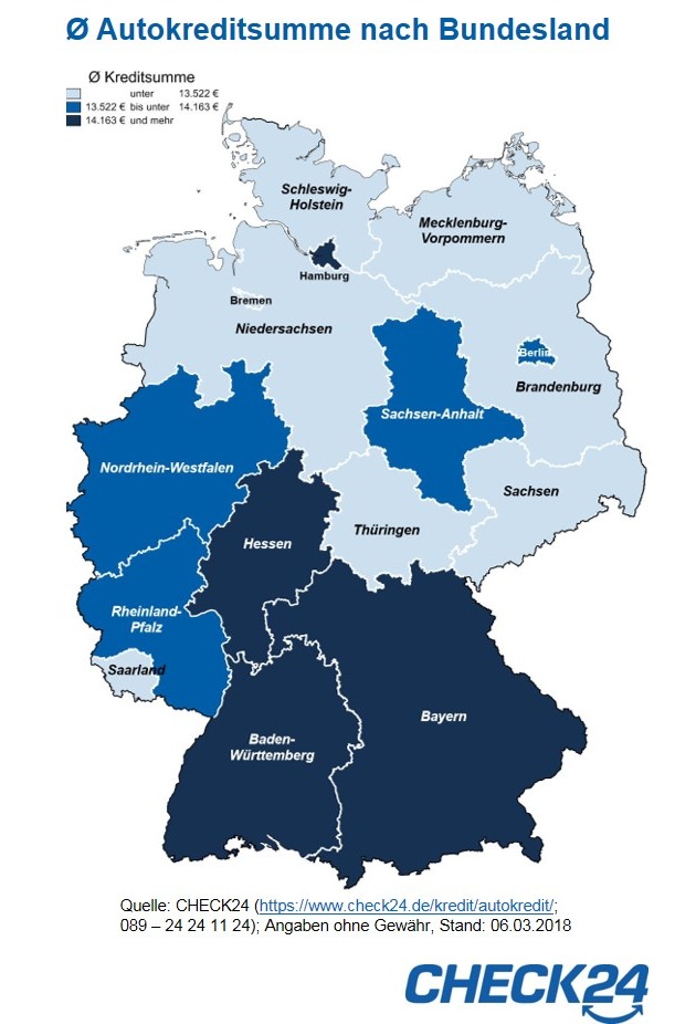 1) Betrachtet wurden alle 2017 über CHECK24 abgeschlossenen Kredite mit dem Verwendungszweck Neu- oder Gebrauchtwagen. 2) Bundeslandliste: http://ots.de/X7USdZ 3) Quelle: Statistisches Bundesamt, Verdienste auf einen Blick, 2017 (http://ots.de/slhp56 [09.03.2018]