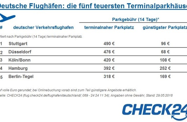 *)Preise gelten für die offiziellen Parkhäuser der 23 betrachteten deutschen Flughäfen. Bei Onlinebuchung vorab sind zum Teil günstigere Angebote erhältlich. Tabellen mit allen betrachteten Flughäfen unter: http://ots.de/rDw07Z. Weitere Informationen unter: https://flug.check24.de/service/parken-am-flughafen.