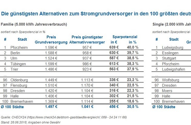 Durch einen Anbieterwechsel spart eine Familie (Stromverbrauch: 5.000 kWh pro Jahr) im Durchschnitt der 100 größten deutschen Städte 456 Euro.*) Ein Vierpersonenhaushalt aus Pforzheim zahlt im Jahr sogar 639 Euro weniger, wenn er aus der Grundversorgung in den günstigsten Alternativtarif wechselt. Auch in Bremerhaven, der Stadt mit dem geringsten Sparpotenzial, werden beim Alternativanbieter noch 255 Euro weniger pro Jahr fällig als in der Grundversorgung. "Hohe Stromkosten senken Verbraucher am einfachsten mit einem Anbieterwechsel", sagt Dr. Oliver Bohr, Geschäftsführer Energie bei CHECK24. "Das gilt vor allem, wenn sie noch teuren Strom aus der Grundversorgung beziehen."