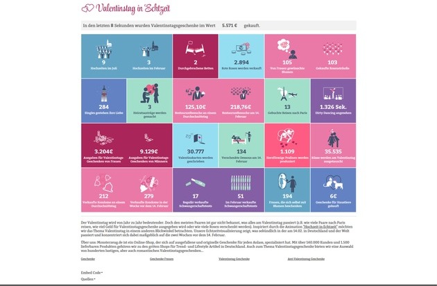 Die interaktive Echtzeitvisualisierung von Monsterzeug.de macht die interessantesten Zahlen und Daten zum Fest der Liebe erlebbar. Valentinstag in Echtzeit http://www.monsterzeug.de/Valentinstag-in-Echtzeit/ zeigt auf einen Blick, was rund um den Valentinstag innerhalb von 1 Sekunde in Deutschland passiert. Wie viele Menschen gerade Valentinskarten verschenken, wie viele Menschen nach Paris reisen und wie viele Kondome gekauft werden.