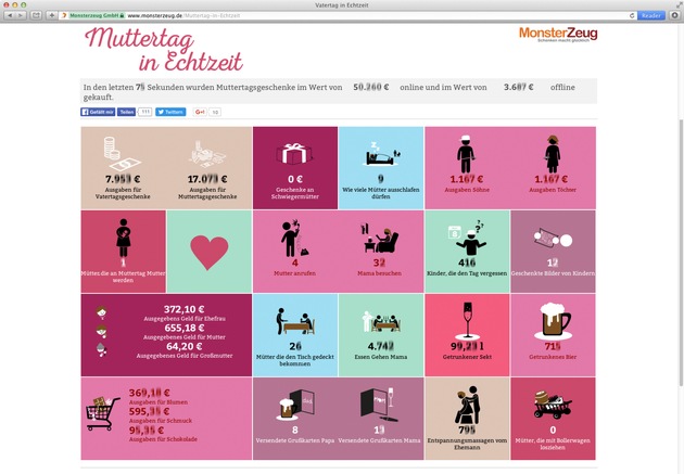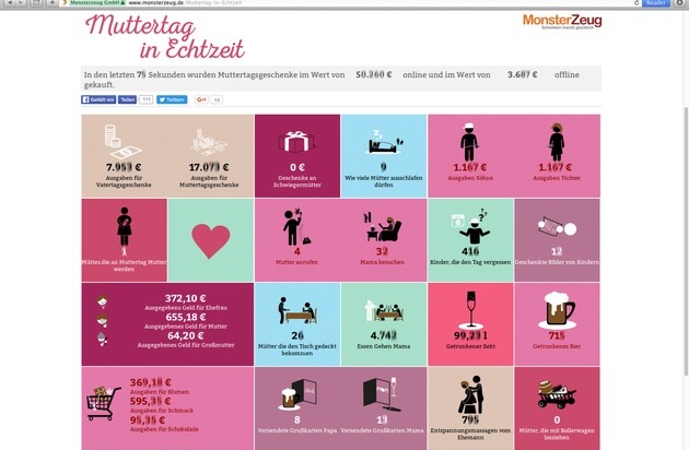 Der Betrachter erfährt dabei die beliebtesten Muttertagsgeschenke und wie viel Geld dafür ausgegeben wird. Wie viele Ehemänner die Mutter ihrer Kinder massieren und auch wie viele Frauen mit dem Bollerwagen losziehen. All das, und noch viel mehr, animiert die Website von Monsterzeug auf Sekundenbasis.