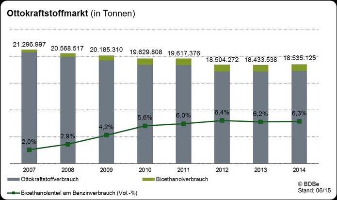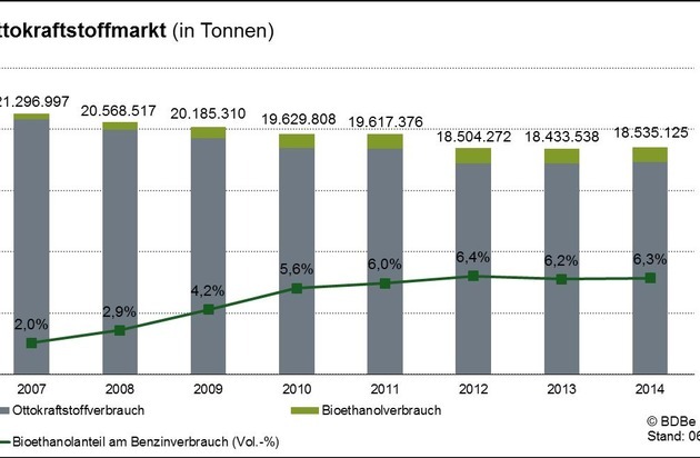 Der deutsche Benzinmarkt war 2014 erstmals seit Jahren nicht rückläufig und erzielte einen Absatz von 18,5 Mio. Tonnen, ein leichter Zuwachs von 0,6 Prozent. Bioethanol hatte einen Anteil am gesamten Benzinmarkt von 6,3 Prozent (Vol.), im Vorjahr betrug der Anteil 6,2 Prozent (Vol.).