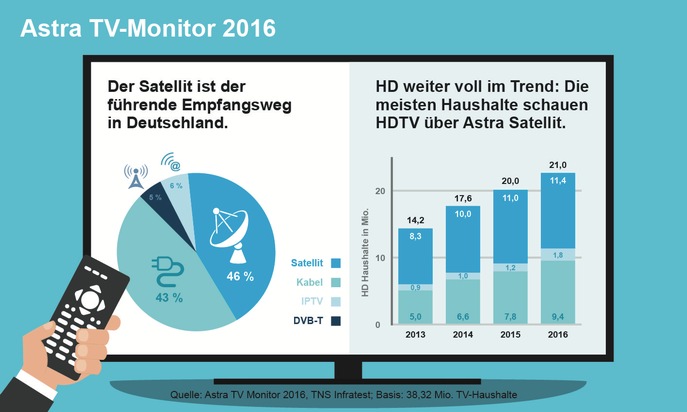 Laut aktuellem Astra TV-Monitor* 2016 ist der Satellit die reichweitenstärkste TV-Infrastruktur in Deutschland: 46 Prozent (17,6 Mio.) der 38,3 Millionen TV-Haushalte in Deutschland empfangen ihre Programme über Satellit. Dahinter folgt der Fernsehempfang via Kabel mit 43 Prozent (16,6 Mio.). Das digitale Antennenfernsehen DVB-T kommt auf einen Marktanteil von 5 Prozent (1,8 Mio.), das lineare Internetfernsehen IPTV liegt bei 6 Prozent (2,3 Mio.).