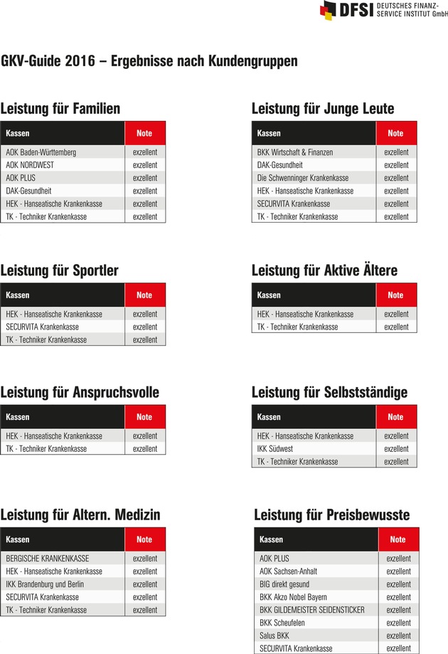 Viele Gesetzliche Krankenkassen bieten mehr als gesetzlich vorgeschrieben. Die DFSI Deutsches Finanz-Service Institut GmbH hat deshalb für acht Modellkunden untersucht, welche Kassen das beste Angebot haben. Insgesamt konnte 35-mal die Bestnote "Exzellent" vergeben werden. Mit AOK Plus, DAK Gesundheit, HEK - Hanseatischer Krankenkasse, TK - Techniker Krankenkasse und Securvita Krankenkasse schafften es fünf Kassen, mehrfach mit der Bestnote ausgezeichnet zu werden. Zudem wurde in einer Langzeitbetrachtung ermittelt, welche Kassen seit Jahren für bestimmte Modellkunden bestens geeignet sind.