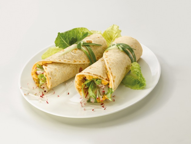 Zutaten (für 2 Personen): Zwei Wraps, ein Salatherz, zwei Radieschen, ein Becher Obazda, Schnittlauch, Salatdressing Zubereitung: Radieschen und Salat waschen. Ein Drittel vom Salat längs in breite Streifen schneiden. Radieschen in feine Streifen schneiden. Die Wraps vor dem Füllen kurz in der Pfanne erhitzen. Mit Obazda bestreichen und mit Salat- und Radieschenstreifen belegen. Wraps straff zusammenrollen und mit einem langen Schnittlauchhalm zusammenbinden. Den restlichen Salat marinieren und zusammen mit den gefüllten Wraps auf einem Teller anrichten.