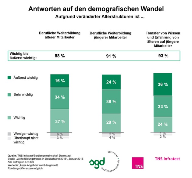 Der demografische Wandel beschäftigt die Arbeitswelt: Viele Wissensträger sehen in den nächsten Jahren dem Eintritt in den Ruhestand entgegen. Mit ihnen scheidet wertvolles Wissen aus. Gleichzeitig gibt es zu wenig junge Nachwuchskräfte. In der Personalentwicklung rücken demzufolge der Aufbau und Erhalt von Wissen zusehends in den Fokus. So spielt für rund neun von zehn Personalverantwortlichen der Wissenstransfer von Alt auf Jung und die berufsbegleitende Weiterentwicklung älterer sowie jüngerer Mitarbeiter künftig eine große Rolle im demografischen Wandel. Dies geht aus der TNS Infratest-Studie "Weiterbildungstrends in Deutschland 2015" hervor, die im Auftrag der Studiengemeinschaft Darmstadt (SGD) unter 300 Personalverantwortlichen durchgeführt wurde. 65 Prozent der Befragten gehen davon aus, dass der demografische Wandel generell zu einem steigenden Weiterbildungsbedarf führen wird.