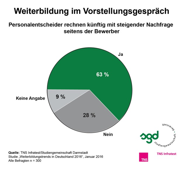 Bereits zum achten Mal in Folge führte TNS Infratest im Auftrag der Studiengemeinschaft Darmstadt (SGD) die Umfrage "Weiterbildungstrends in Deutschland" durch. Dafür wurden in diesem Jahr 300 Personalverantwortliche online zu unterschiedlichen Aspekten der beruflichen Weiterbildung befragt. Eine zusammenfassende Broschüre zu den Ergebnissen wird in Kürze auf www.sgd.de veröffentlicht.
