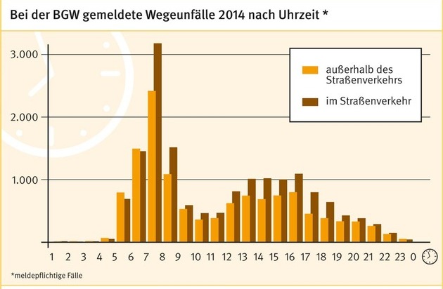 Auch außerhalb des Straßenverkehrs ereigneten sich zwischen sieben und acht am meisten Unfälle zwischen Wohnung und Arbeitsstätte: Gut 2.400 zählte die BGW hier im Jahr 2014, gefolgt von knapp 1.500 zwischen sechs und sieben sowie gut 1.000 zwischen acht und neun Uhr. Berücksichtigt wurden alle Wegeunfälle, die mehr als drei Tage Arbeitsunfähigkeit nach sich zogen.