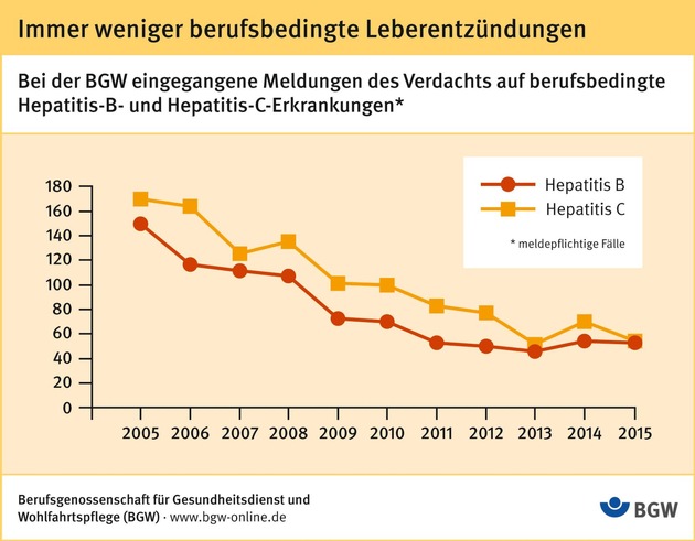 "Bei der Prävention von berufsbedingten blutübertragbaren Virushepatitiden sind durch vermehrte Impfungen und einen verbesserten Schutz vor Nadelstichverletzungen in den vergangenen Jahren große Erfolge erzielt worden", berichtet Prof. Dr. Albert Nienhaus, Leiter der Abteilung Arbeitsmedizin und Gesundheitswissenschaften der BGW. Die Zahl der bei der Berufsgenossenschaft eingegangenen meldepflichtigen Verdachtsanzeigen berufsbedingter Hepatitis-B-Erkrankungen sank zwischen 2005 und 2015 um rund 60 Prozent von 146 auf 57. Noch stärker ging die Meldung von Hepatitis-C-Erkrankungen an die BGW zurück: Hier fiel die Zahl der meldepflichtigen Verdachtsanzeigen von 168 im Jahr 2005 auf 53 im Jahr 2015.