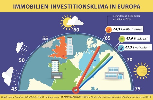 Der Immobilien-Investitionsklimaindex von Union Investment wird seit 2005 (seit Frühjahr 2008 halbjährlich) unter den europäischen Immobilieninvestoren ermittelt. Der Index berechnet sich aus den vier Teilindikatoren "Marktstruktur", "Rahmenbedingungen", "Standortbedingungen" und "Erwartungen", die mit jeweils 25 Prozent gewichtet werden. Für den Index befragte das Marktforschungsinstitut Ipso im Zeitraum Mai bis Juni 2016 insgesamt 161 Immobilienunternehmen und institutionelle Immobilienanleger in Deutschland (n=61), Frankreich (n=50) und Großbritannien (n=50).