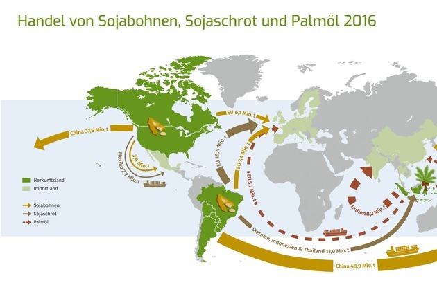 Weltweit angebaut wird jeweils dort, wo die besten klimatischen Voraussetzungen für Anbau und Wachstum der Nutzpflanzen und damit auch für die höchste Flächeneffizienz bestehen, in den so genannten Gunstregionen. Das dient auch dem Klimaschutz. "Deutschland und Europa sind aufgrund ihrer geografischen Lage von Sojaimporten abhängig. Es ist kaum möglich, in der aktuellen Selbstversorgung mit Eiweißfuttermitteln von nur 30 bis 35 Prozent mit heimischen Futtermitteln erheblich aufzuschließen", so Kleinschmit von Lengefeld.