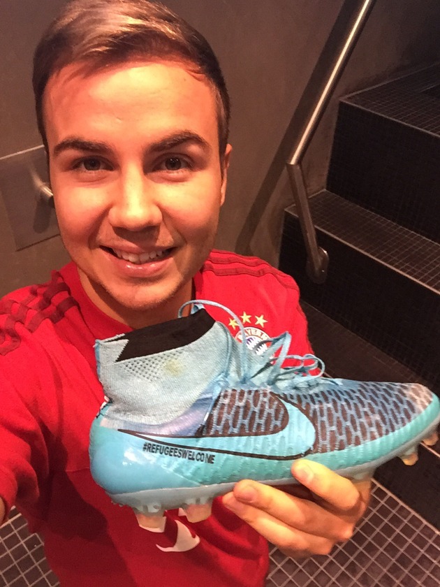Mario Götze beweist mit einer besonderen Initiative erneut, dass er über den Tellerrand blickt und setzt seine Popularität für den guten Zweck ein. In der UEFA Champions League-Partie gegen Olympiakos Piräus und dem Bundesligaspiel gegen Darmstadt 98 trug der Bayern-Profi seine Nike-Fußballschuhe mit #refugeeswelcome-Schriftzug. Nun lässt er diese zugunsten der Flüchtlings-Projekte der Stadt München und der Aktion Deutschland Hilft auf www.unitedcharity.de versteigern.