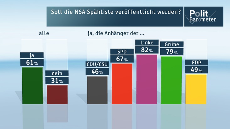 In der strittigen Frage der Veröffentlichung der NSA-Spähliste, auf deren Basis der BND Informationen auch über deutsche Firmen und Personen an die NSA geliefert haben soll, spricht sich eine Mehrheit von 61 Prozent dafür aus, diese Liste dem Bundestag zugänglich zu machen, 31 Prozent sind dagegen (Rest zu 100 Prozent hier und im Folgenden jeweils "weiß nicht"). Im Detail sind die Anhänger der SPD (67 Prozent), der Grünen (79 Prozent) und der Linken (82 Prozent) mehrheitlich für eine Offenlegung der Liste, aber auch von den Anhängern der CDU/CSU fordern dies 46 Prozent und von den Anhängern der FDP 49 Prozent. Gespalten sind die Deutschen hinsichtlich der Konsequenzen, die eine solche Veröffentlichung auch gegen den Willen der USA mit sich bringen könnte: 46 Prozent rechnen damit, dass US-Geheimdienste Deutschland dann wichtige Informationen vorenthalten werden, 44 Prozent glauben das nicht.