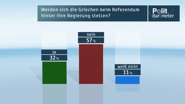 Die Umfrage zum Politbarometer wurde wie immer von der Mannheimer Forschungsgruppe Wahlen durchgeführt. Die Interviews wurden in der Zeit vom 30. Juni bis 2. Juli 2015 bei 1234 zufällig ausgewählten Wahlberechtigten telefonisch erhoben. Die Befragung ist repräsentativ für die wahlberechtigte Bevölkerung in Deutschland. Der Fehlerbereich beträgt bei einem Parteianteil von 40 Prozent rund +/- drei Prozentpunkte und bei einem Parteianteil von 10 Prozent rund +/- zwei Prozentpunkte. Daten zur politischen Stimmung: CDU/CSU: 45 Prozent, SPD: 28 Prozent, Linke: 8 Prozent, Grüne: 11 Prozent, FDP 3 Prozent, AfD: 4 Prozent. Das nächste Politbarometer sendet das ZDF am Freitag, 24. Juli 2015.