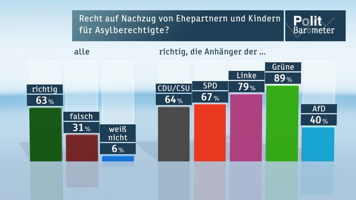 Anerkannte Asylbewerber haben in Deutschland das Recht, ihre Ehepartner und minderjährige Kinder nachkommen zu lassen. Dieses Recht befürworten 63 Prozent, während sich 31 Prozent dagegen aussprechen. Das Recht auf Familiennachzug wird mehrheitlich von allen Parteianhängergruppen unterstützt mit Ausnahme derjenigen der AfD. Dort gibt es nur 40 Prozent Zustimmung, aber 57 Prozent Ablehnung.
