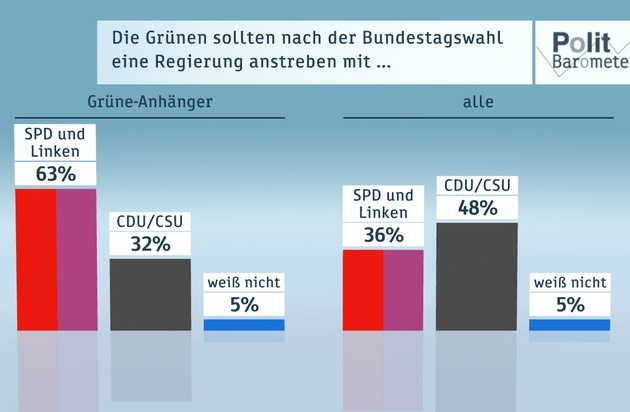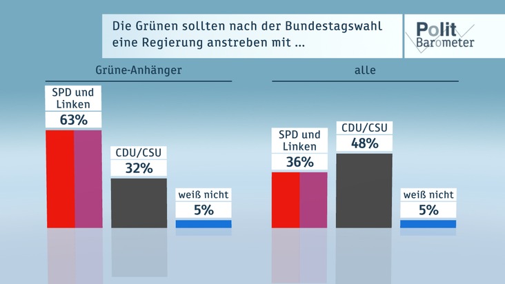 Unabhängig davon meinen 51 Prozent, dass die Grünen vor der nächsten Bundestagswahl sagen sollen, mit wem sie nach der Wahl zusammen regieren wollen, 40 Prozent sehen eine solche Notwendigkeit nicht.
