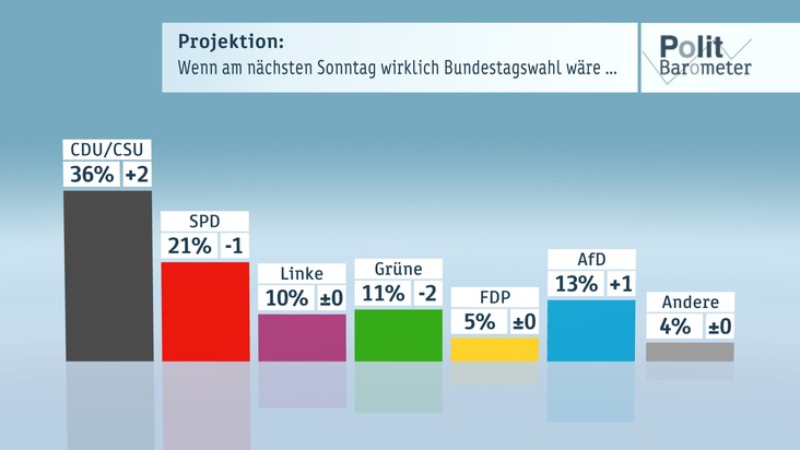 Wenn am nächsten Sonntag wirklich Bundestagswahl wäre, käme die CDU/CSU auf 36 Prozent (plus 2) und die SPD auf 21 Prozent (minus 1), die Linke auf 10 Prozent (unverändert), die Grünen auf 11 Prozent (minus 2) und die FDP auf 5 Prozent (unverändert). Die AfD würde 13 Prozent (plus 1) erreichen und die anderen Parteien zusammen unverändert 4 Prozent. Damit gäbe es weiterhin eine klare Mehrheit für CDU/CSU und SPD. Von den politisch denkbaren Dreierbündnissen würde es auch reichen für eine Koalition aus CDU/CSU, Grünen und FDP - nicht aber für Rot-Rot-Grün.