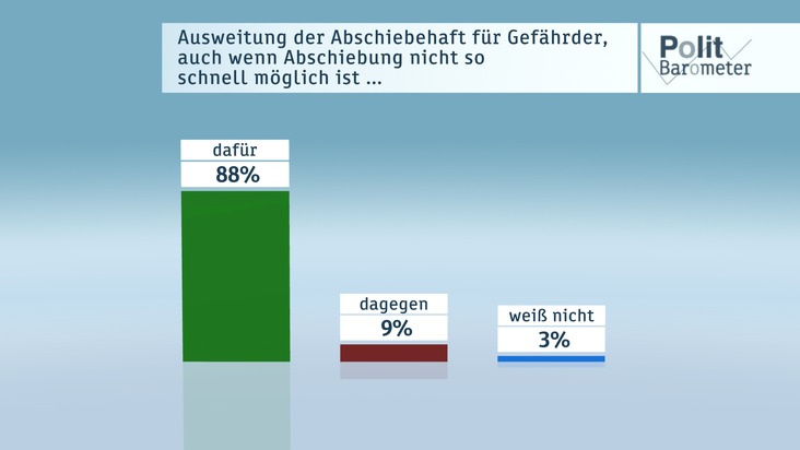 Diese Woche haben sich Justizminister Heiko Maas und Innenminister Thomas de Maizière auf verschiedene Maßnahmen als Folge des Terroranschlags im Dezember geeinigt. So sollen in Zukunft Asylbewerber, die aufgrund von Kontakten zu Terrororganisationen als so genannte Gefährder eingestuft werden, länger als bisher in Abschiebehaft genommen werden können, auch wenn so schnell keine Abschiebung in ihr Heimatland möglich ist. Eine solche Ausweitung der Abschiebehaft für Gefährder wird von 88 Prozent aller Befragten gutgeheißen und lediglich von 9 Prozent abgelehnt.