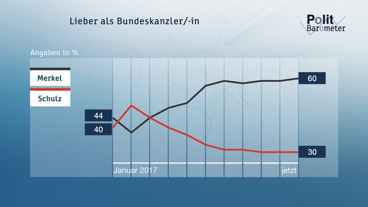 In die langsam beginnende heiße Phase des Wahlkampfs starten die CDU/CSU und die Kanzlerin mit einem unverändert deutlichen Vorsprung vor der SPD und Martin Schulz. Daran hat auch die Regierungskrise in Niedersachsen nichts geändert.