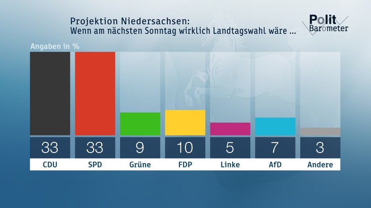 Gut eine Woche vor der Landtagswahl in Niedersachsen liegen CDU und SPD gleichauf, die FDP könnte knapp vor den Grünen drittstärkste Kraft werden, während die AfD mit einem deutlich schlechteren Ergebnis rechnen müsste als vor zwei Wochen bei der Bundestagswahl. Ob die Linke den Einzug in den Landtag schafft, bleibt unklar.