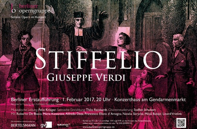 Dem Berliner Publikum wird das musikalische Highlight von der auf seltene Opern spezialisierten "Berliner Operngruppe" um Dirigent Felix Krieger präsentiert. Das junge Ensemble führt den Stiffelio mit Unterstützung von Bertelsmann im Konzerthaus am Gendarmenmarkt semiszenisch auf. Zu den Solisten zählen auch zwei Talente aus dem von Liz Mohn geförderten Opernstudio der Staatsoper Berlin.