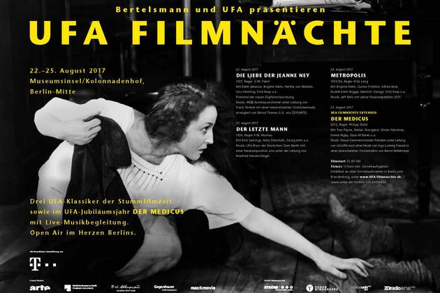 DIE LIEBE DER JEANNE NEY (1927), Regie: G.W. Pabst Mit Édith Jéhanne, Brigitte Helm, Hertha von Walther, Uno Henning, Fritz Rasp u.a. Premiere der neuen Digitalrestaurierung Musik: WDR Funkhausorchester unter Leitung von Frank Strobel mit einer rekonstruierten Orchestermusik, arrangiert von Bernd Thewes (i.A. von ZDF/ARTE) Mittwoch, 23. August 2017, Einlass: 20:30 Uhr, Filmbeginn: 21:00 Uhr DER LETZTE MANN (1924), Regie: F.W. Murnau Mit Emil Jannings, Maly Delschaft, Georg John u.a. Musik: UFA Brass der Deutschen Oper Berlin unter der Leitung von Manfred Honetschläger mit einer Neukomposition von Manfred Honetschläger Donnerstag, 24. August 2017, Einlass: 20:30 Uhr, Filmbeginn: 21:00 Uhr METROPOLIS (1925/26), Regie: Fritz Lang Mit Brigitte Helm, Gustav Fröhlich, Alfred Abel, Rudolf Klein-Rogge, Heinrich George, Fritz Rasp u.a. Musik: Jeff Mills mit einer Neukomposition Freitag, 25. August 2017, Einlass: 20:30 Uhr, Filmbeginn: 21:00 Uhr UFA FILMNÄCHTE EXTENDED DER MEDICUS (2013), Regie: Philipp Stölzl Mit Tom Payne, Stellan Skarsgård, Olivier Martinez, Emma Rigby, Elyas M'Barek u.a. Musik: Neues Kammerorchester Potsdam unter Leitung von Ud Joffe nach einer Musik von Ingo Ludwig Frenzel in einer überarbeiteten Orchestration von Bernd Wefelmeyer