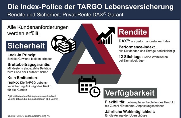 Die anhaltende Niedrigzinsphase, gesetzliche Rahmenbedingungen, der demographische Wandel und schwankende Märkte zwingen Versicherer und Sparer zum Umdenken. Mit der Privat-Rente DAX® Garant hat der Kunde die Möglichkeit, die Chancen des Kapitalmarktes zu nutzen. "Es sind heute Produkte gefragt, die dem Grundbedürfnis unserer Kunden nach Sicherheit nachkommen und gleichzeitig attraktive Rendite generieren", erklärt Bernd-Leo Wüstefeld, Vertriebsvorstand der TARGO Versicherungen. "Uns war es daher ganz wichtig, auf den DAX zu setzen, denn dieser Index ist für die Kunden transparent und nachvollziehbar."