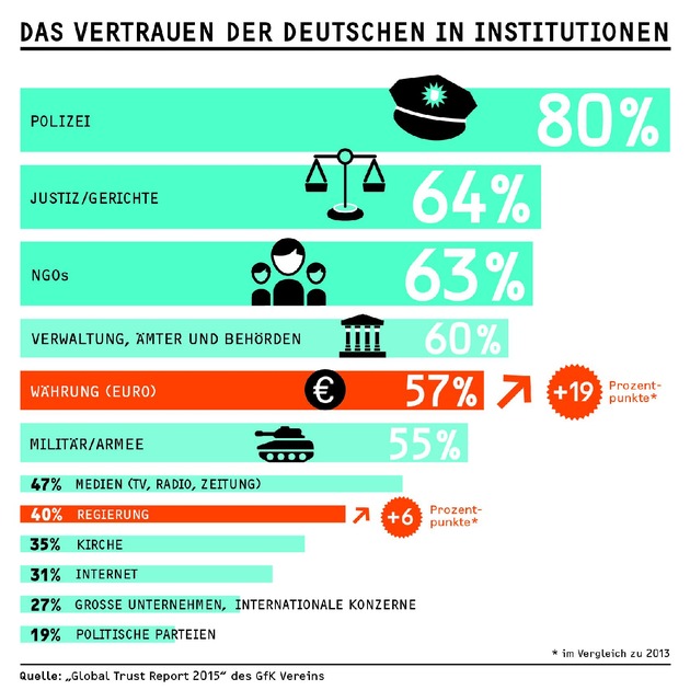 57 Prozent der Deutschen schenken dem Euro ihr Vertrauen. Das sind 19 Prozentpunkte mehr als in der Befragung des Jahres 2013. Damit nimmt der Euro im Ranking der vertrauenswürdigsten Institutionen den fünften Platz ein. "Ein Grund für diese Steigerung dürfte die moderate Teuerungsrate sein, vor allem die momentan vergleichsweise stabilen Energiekosten", sagt Professor Dr. Raimund Wildner, Geschäftsführer des GfK Vereins. Die meisten anderen Institutionen, nach denen der GfK Verein jährlich fragt, behaupten ihren Platz im Ranking. Die Polizei führt weiterhin mit 80 Prozent, gefolgt von den Gerichten mit 64 Prozent. Im internationalen Vergleich erreicht die deutsche Polizei damit einen glänzenden Wert. Besonders misstrauisch reagieren dagegen die Nigerianer und Argentinier: Nur 13 Prozent bzw. 21 Prozent sprechen der Polizei ihr Vertrauen aus.