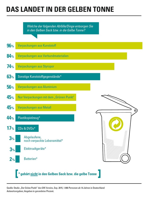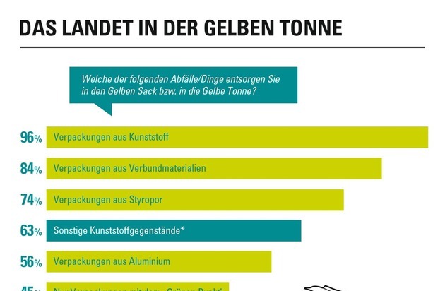 In der praktischen Handhabung stellt sich die Situation allerdings etwas anders dar, denn es gelangen doch viele Dinge in die gelben Behälter, die dort nichts zu suchen haben. So entsorgen 63 Prozent der Befragten neben Kunststoffverpackungen auch andere Kunststoffgegenstände mit dem gelben Sack/ der gelben Tonne. Immerhin 44 Prozent werfen auch Plastikspielzeug in den gelben Mülleimer. In der Recyclingbranche bezeichnet man die Entsorgung dieser Gegenstände als "intelligente Fehlwürfe": vom Material her richtig entsorgt, nur dass es sich hierbei um keine Verpackungen handelt und sie deshalb nicht in den gelben Sack gehören. Aber auch CDs und DVDs (17 Prozent) oder abgelaufene, verpackte Lebensmittel finden fälschlicherweise ihren Weg in das Duale System.