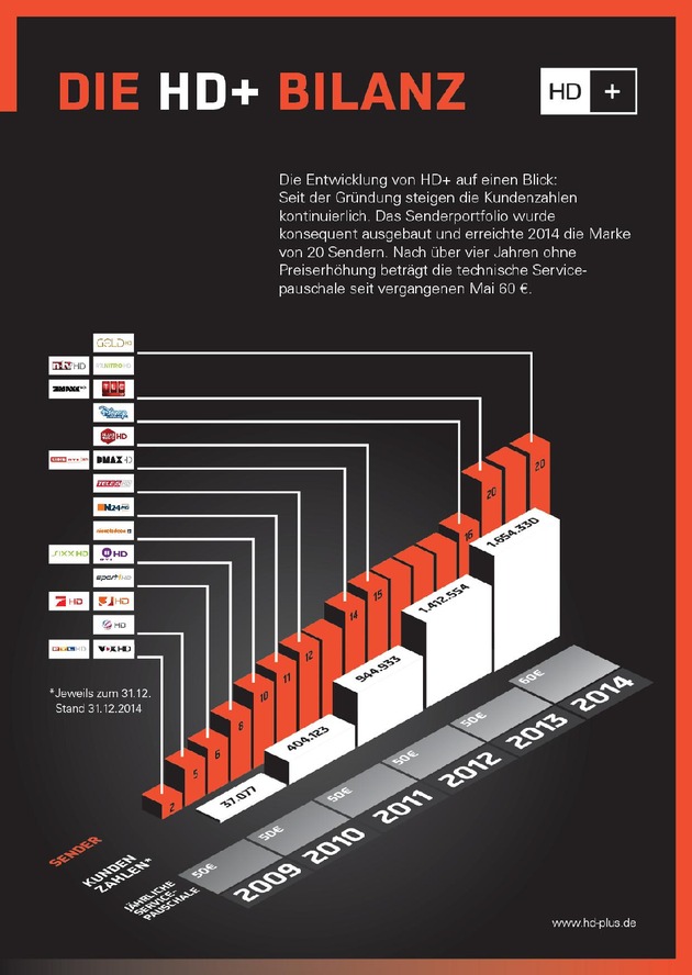 Das Geschäftsjahr 2014 stand ganz im Zeichen der Weiterentwicklung. Mit dem Disney Channel HD, RTL NITRO HD, n-tv HD, ProSieben MAXX HD und TLC HD sind 2014 fünf neue Sender auf die HD+ Plattform aufgeschaltet worden. Am 1. Januar 2015 ist SAT.1 Gold HD dazugekommen. Neben 20 der größten Privatsender können HD+ Kunden auch mehr als 30 weitere Sender in bester Bild- und Tonqualität empfangen.