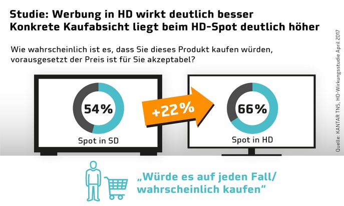 Werbespots in HD zeigen deutlich bessere Werte bei positiver Wahrnehmung, Aktivierung und letztendlich auch bei konkreter Kaufabsicht gegenüber gleichen Spots in SD. Das belegt eine aktuelle Studie zur Werbewirkung von Kantar TNS im Auftrag von HD+. So gefiel Probanden, die einen Werbespot für ein Fast-Moving Consumer Good (FMCG) in HD-Qualität sahen, der Spot um 33 Prozent besser als derselbe Spot in SD. Bei der SD-Variante des Spots konstatierten dies lediglich 46 Prozent. Auch bei der positiven Wirkung auf die Marke zeigt der HD-Spot deutlich bessere Werte: 53 Prozent der Befragten, die den Spot in HD sahen, gaben an, dass sie nun eine bessere Meinung über die Marke hätten - im Gegensatz zu 42 Prozent, die die SD-Variante des Spots schauten. Das entspricht einem prozentualen Unterschied von 26 Prozent. Die positive Wahrnehmung geht beim HD-Spot Hand in Hand mit einer deutlich höheren Motivation, sich etwa über das Produkt weiter zu informieren oder anderen über das Produkt zu erzählen. So ist die Motivations- und Aktivierungsleistung beim Spot in HD um 55 Prozent höher als beim Spot in SD. Und letztendlich schlagen sich diese Ergebnisse sehr auffällig in der konkreten Kaufabsicht nieder. Wenn der Spot in HD-Qualität gesehen wird, würden 66 Prozent der Befragten das Produkt auf jeden Fall oder wahrscheinlich kaufen. Bei denjenigen, die den Spot in SD sahen, geben dies deutlich weniger, nämlich 54 Prozent an. Das heißt, die konkreten Kaufabsichten nach Sehen eines HD-Spots liegen um 22 Prozent höher als beim selben Werbespot ins SD.