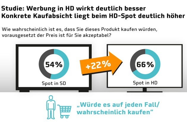 Positive Wahrnehmung: Werbespot in HD-Qualität gefällt Befragten um 33 Prozent besser als in SD // Starke Motivation: Motivations- und Aktivierungsleistung des Spots in HD um 55 Prozent höher // Größeres Käuferpotenzial: Konkrete Kaufabsicht ist beim HD-Spot um 22 Prozent höher