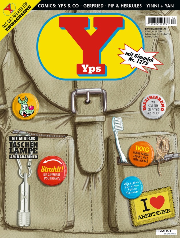 Yps #1275 erscheint am 14.7. mit einer genialen Taschenlampe am Karabiner und original Yps-Gravur. Dabei bringt das Magazin außerdem u.a. aus wissenschaftlicher Sicht Licht ins Dunkel des Star Trek-Universums und berichtet über den 90. Geburtstag der "Formel 1". Zudem warten dieses Mal über 40 Seiten Comics mit Gastauftritten von Rüdiger Nehberg und der abgedankten Cindy aus Marzahn auf die Leser.