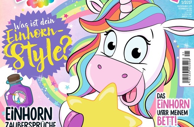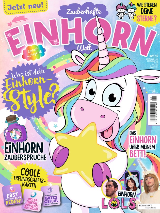 Der Einhorn-Hype erreicht das Zeitschriftenregal! Mit "Zauberhafte Einhorn-Welt" tauchen ab 5. September alle Einhorn-Fans in die magische, fabelhafte Welt der glitzernden und funkelnden Einhörner ein. Mit fantastischen Rätseln und tollen Spielen lässt es den Leser auf regenbogenbunten Seiten in guter Laune schweben und bietet jede Menge Spaß. Ausgestattet ist das "Zauberhafte Einhorn-Welt"-Magazin mit witzigen Postern, lustigen Quiz-Seiten und traumhaften Styling-Tipps für den eigenen Einhorn-Look.