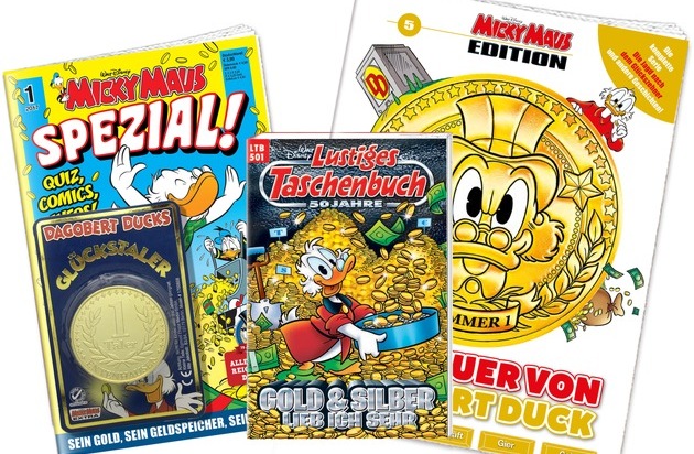 Am 1. Dezember gibt es mit zwei Titeln einen Doppelaufschlag der Feierlichkeiten: So erscheint mit "Micky Maus Spezial" eine Sonderausgabe zu Dagobert Duck mit tollen Comics und aufregenden Fakten zum Jubiläum der reichsten Ente der Welt. Besonders spannend: Als Extra liegt dem Magazin Dagoberts wertvollster Besitz - sein erster Glückstaler - bei.