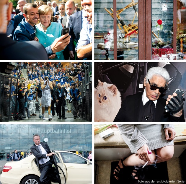 Der erste Preis in der Kategorie Sport ging an Lukas Schulze, der sich bei der Basketball-EM eine interessante Position ausgesucht hatte, um einen enttäuschten Dirk Nowitzki nach dem Vorrunden-Aus aufzunehmen. In der Kategorie Politik ging der erste Preis an Bernd von Jutrczenka - das Motiv zeigt Angela Merkel, die sich beim Besuch einer Erstaufnahmeeinrichtung für Asylbewerber für ein Selfie mit einem Flüchtling fotografieren lässt. In der Kategorie Wirtschaft gefiel der Jury am besten ein Bild von Rainer Jensen, das einen energischen Claus Weselsky beim Verlassen eines Taxis vor dem Berliner Hauptbahnhof festhielt. Malte Christians erhielt den ersten Preis in der Kategorie Feature & Vermischtes für ein Foto des Café "Bonne Bière" nach den Terroranschlägen in Paris. In der Kategorie Kultur & Entertainment überzeugte Jens Kalaene mit einer Aufnahme des Modedesigners Karl Lagerfeld bei einer Vernissage in Berlin.