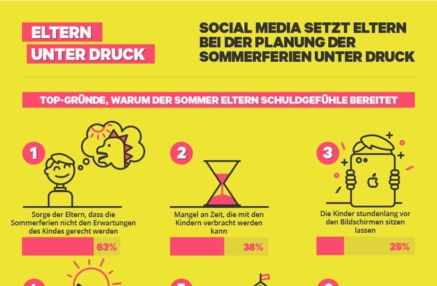 - Über die Hälfte der befragten Eltern (63 Prozent) befürchten, dass die geplanten Sommerferien nicht den Erwartungen ihres Kindes gerecht werden. - 38 Prozent der Eltern fühlen sich schuldig, dass sie nicht mehr Zeit mit ihren Kindern in den Sommerferien verbringen können. - Um den Zeitmangel mit Geschenken und Freizeitaktivitäten zu kompensieren, geben Eltern ein zusätzliches Budget von 1.332 EUR pro Kind in den Sommerferien aus.