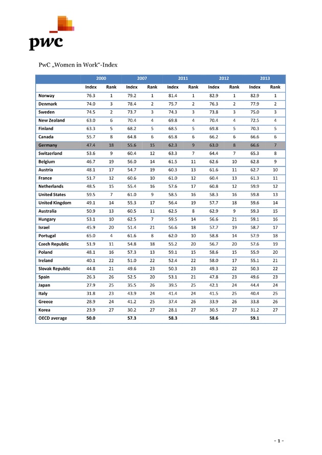Deutschland verbessert sich im PwC-"Women in Work"-Index auf Rang 7 /
