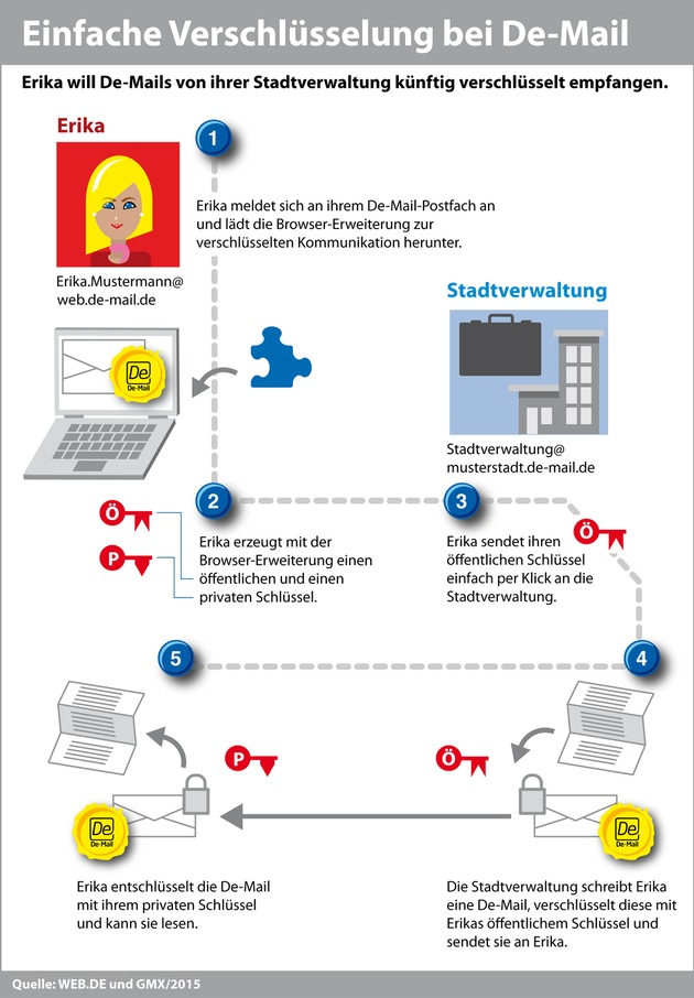 Bei der Verschlüsselungstechnik setzen WEB.DE und GMX auf das weltweit anerkannte Verfahren "Pretty good Privacy" (PGP). Bei dem sogenannten "Schlüsselverfahren" wird jedem Nutzer ein eindeutiges Schlüsselpaar zugeordnet: den öffentlichen und den privaten Schlüssel. De-Mails an einen Empfänger werden mit dessen öffentlichem Schlüssel verschlüsselt und können dann mithilfe seines privaten Schlüssels nur von ihm selbst entschlüsselt werden.