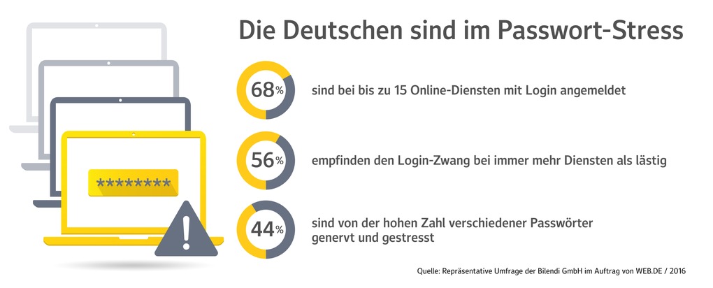 Fast jeder zweite Internet-Nutzer in Deutschland (44%) fühlt sich von der steigenden Menge an Passwörtern für den Zugang zu Diensten gestresst. Das geht aus einer repräsentativen Umfrage hervor, die das Internet-Portal WEB.DE zum heutigen Tag der Passwort-Sicherheit veröffentlicht. Viele Internet-Nutzer vernachlässigen deswegen die Sicherheit.